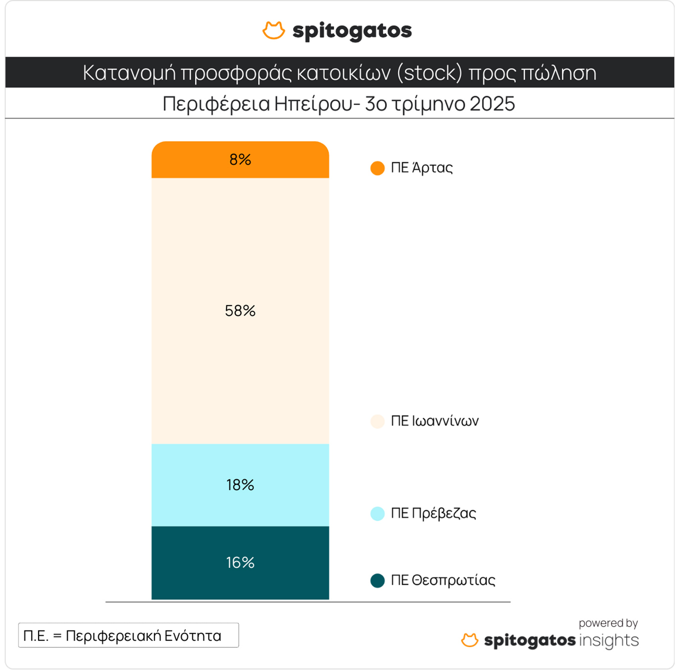 Όσον αφορά το διαθέσιμο stock κατοικιών προς πώληση, περισσότερο από το 50% συγκεντρώνεται στην Π.Ε. Ιωαννίνων. Η Πρέβεζα ακολουθεί με 18% και η Θεσπρωτία με 16%, ενώ η Άρτα κρατά μόλις το 8%. Στα ενοίκια, η κυριαρχία των Ιωαννίνων είναι ακόμη μεγαλύτερη, γεγονός που αντανακλά τη συνεχή ζήτηση που δημιουργεί η παρουσία μεγάλου αριθμού φοιτητών και νέων νοικοκυριών.