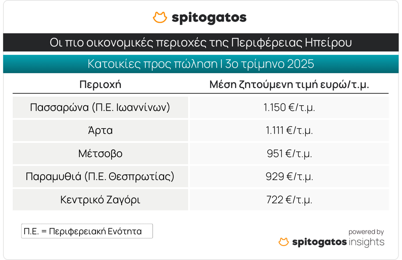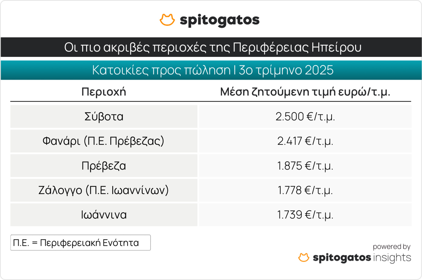 Στις ακριβότερες περιοχές για αγορά κατοικίας, τα Σύβοτα παραμένουν στην κορυφή με μέση ζητούμενη τιμή 2.500 ευρώ/τ.μ., επιβεβαιώνοντας τη διαχρονική τους ελκυστικότητα ως τουριστικού προορισμού υψηλής ζήτησης. Το Φανάρι και ο Δήμος Πρέβεζας συγκαταλέγονται επίσης στις πιο ακριβές περιοχές της Ηπείρου, ενώ οι οικονομικότερες επιλογές βρίσκονται σε Πασσαρώνα, Άρτα, Μέτσοβο, Παραμυθιά και Κεντρικό Ζαγόρι.