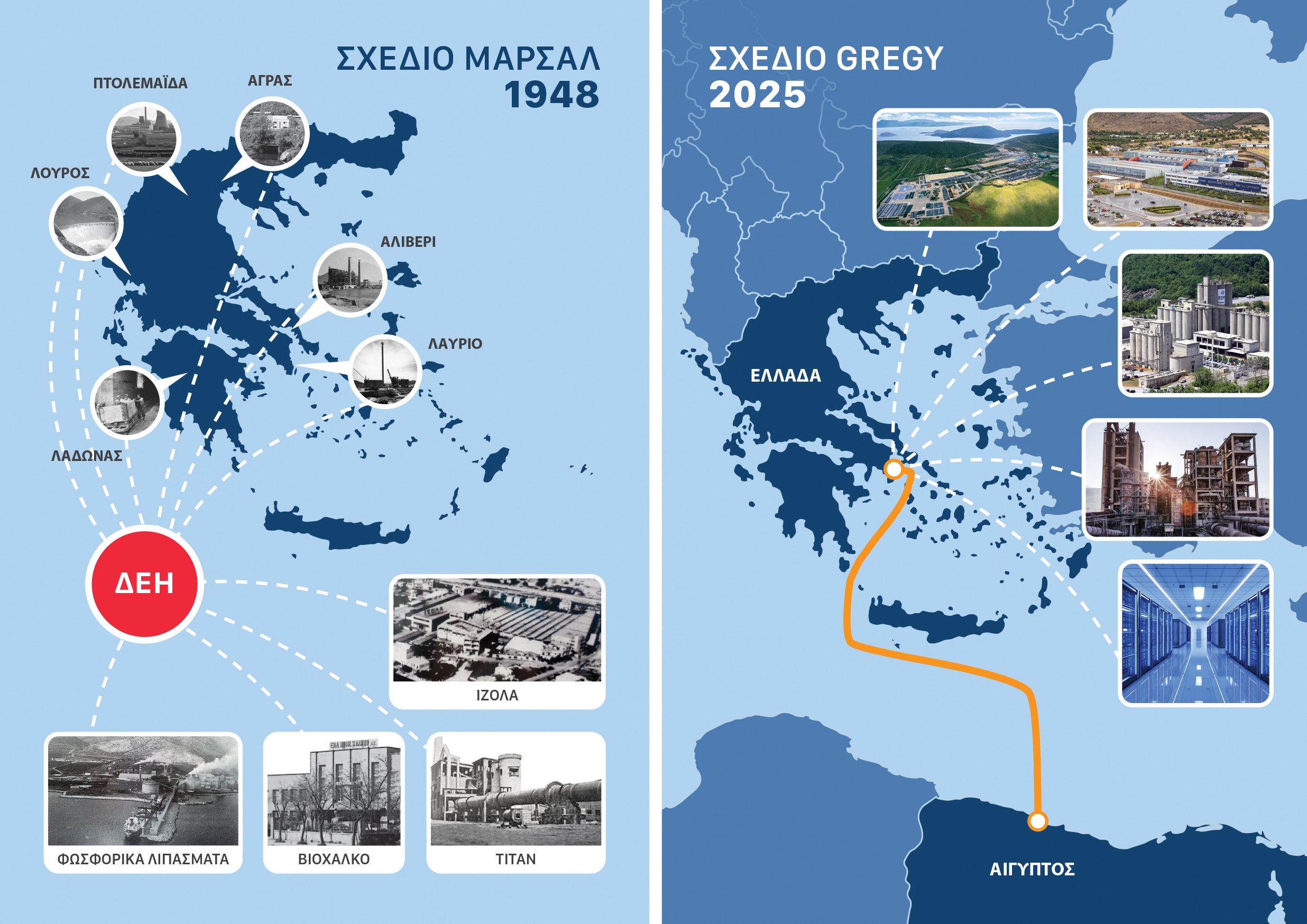 «Η φθηνή ενέργεια από το GREGY μπορεί να φέρει μια πραγματική επανάσταση στη βιομηχανική ανάπτυξη. Θα κάνουμε πάλι την Ελλάδα μια βιομηχανική χώρα», είπε ο κ. Δημήτρης Κοπελούζος, μιλώντας στους δημοσιογράφους. Ο Πρόεδρος του Ομίλου Κοπελούζου σύγκρινε τη σημασία του GREGY με εκείνη του Σχεδίου Μάρσαλ. Υπενθύμισε ότι τότε η ΔΕΗ είχε λάβει 94 εκατ. δολάρια, ποσό που αντιστοιχεί σήμερα σε περίπου 1,3 δισ. ευρώ, για να θεμελιωθεί ο εξηλεκτρισμός. «Σήμερα, 77 χρόνια μετά, επενδύουμε συνολικά 13 δισ. ευρώ στα έργα GREGY και ΑΠΕ για να φέρουμε φθηνό ρεύμα στη βιομηχανία και να ξαναδώσουμε αναπτυξιακή δυναμική στην ελληνική οικονομία. Αυτό κάνει το GREGY, το πιο σημαντικό έργο στην Ελλάδα», τόνισε.