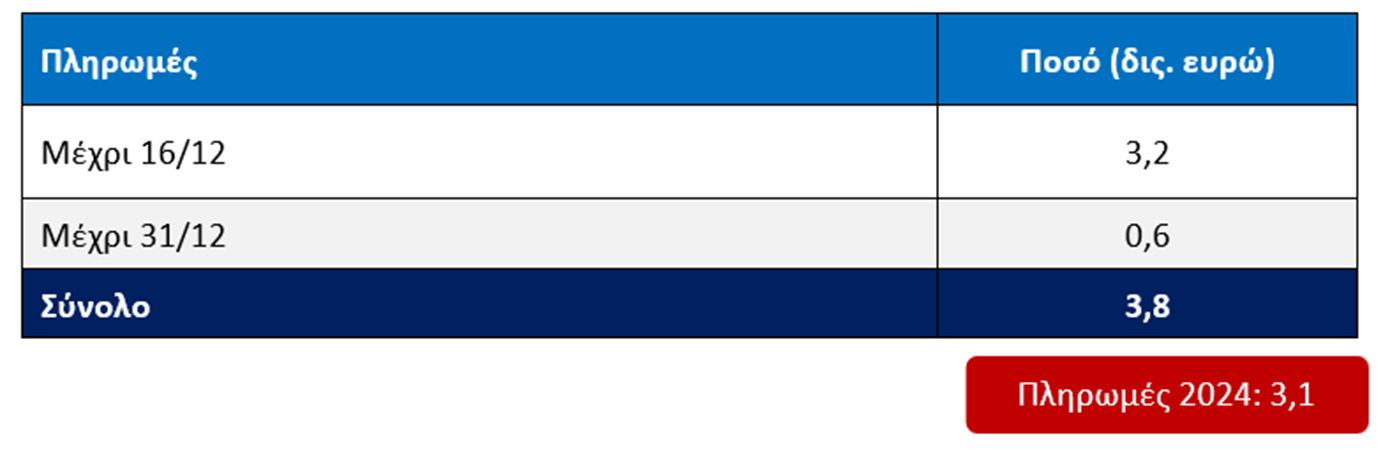 - 14.9 εκατ. ευρώ 33.473 δικαιούχους* για την Ενίσχυση Γεωργών Νεαρής Ηλικίας. Αφορά «παλαιούς» δικαιούχους του καθεστώτος με έτος ένταξης 2021-2024. Με την ολοκλήρωση του διοικητικού ελέγχου του επιπέδου εκπαίδευσης των 14.395 εν δυνάμει νέων δικαιούχων, θα ενταχθούν και θα πληρωθούν το αργότερο έως 30.06.2026 όσοι από αυτούς κριθούν επιλέξιμοι.