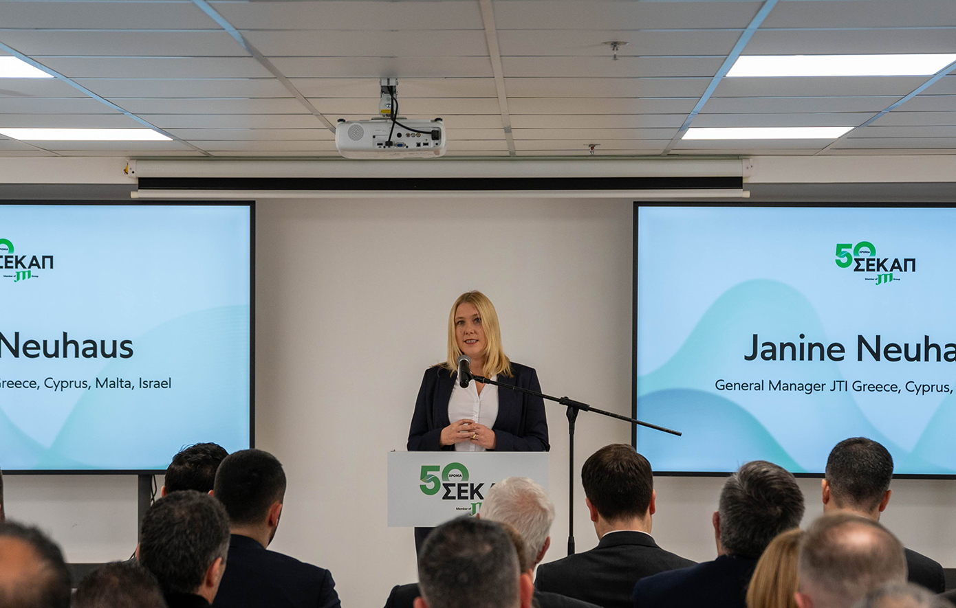 Η Διευθύνουσα Σύμβουλος της JTI Hellas, με ευθύνη για τις αγορές Ελλάδας, Ισραήλ, Κύπρου, και Μάλτας, κ. Janine Neuhaus (Σανίν Νόιχαους), υπογράμμισε ότι η επέτειος των 50 ετών δεν αποτελεί μόνο έναν ιστορικό σταθμό, αλλά κυρίως ένα ορόσημο με το βλέμμα στραμμένο στο μέλλον. Όπως ανέφερε, από την απόκτηση της ΣΕΚΑΠ το 2018, η JTI υλοποιεί επενδύσεις που υπερβαίνουν τα 40 εκατομμύρια δολάρια έως σήμερα, αναβαθμίζοντας τη σε πρότυπο παραγωγικής αριστείας.