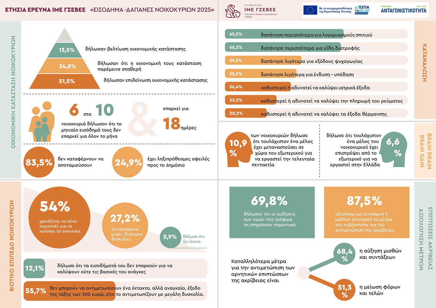 Όπως σημειώνεται συμπερασματικά στην έρευνα, «οι πιέσεις στο εισόδημα των ελληνικών νοικοκυριών επιμένουν και μάλιστα, παρά τις προφανείς ανισότητες, τείνουν να επηρεάσουν όλο και ευρύτερα στρώματα του πληθυσμού, αγγίζοντας πλέον και τα μεσαία εισοδηματικά στρώματα. Σε αυτό το πλαίσιο και με βάση τα ευρήματα της έρευνας, η κοινωνική πλειοψηφία υποστηρίζει ολοένα και περισσότερο λύσεις δομικού χαρακτήρα για την αντιμετώπιση της ακρίβειας, θεωρώντας πιο αποτελεσματικά μέτρα την αύξηση των μισθών, τις φορολογικές ελαφρύνσεις και τον έλεγχο των τιμών έναντι αποσπασματικών παρεμβάσεων όπως τα επιδόματα ή το καλάθι του νοικοκυριού. Αυτό υπογραμμίζει ότι, πέρα από τη στήριξη των ευάλωτων ομάδων, απαιτούνται πολιτικές που να ενισχύουν συνολικά τα εισοδήματα και να διαμορφώνουν συνθήκες οικονομικής σταθερότητας και αξιοπρεπούς διαβίωσης για το σύνολο του πληθυσμού».