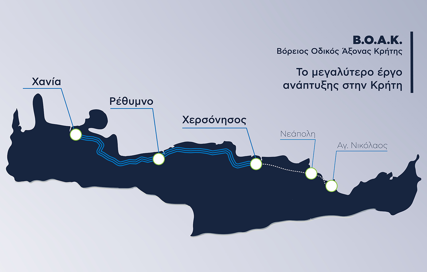 Ο Βόρειος Οδικός Άξονας Κρήτης (Β.Ο.Α.Κ.) έχει συνολικό μήκος περίπου 300 χλμ., περιλαμβάνοντας επίσης τα υπό κατασκευή τμήματα «Χερσόνησος–Νεάπολη» και «Νεάπολη-Άγιος Νικόλαος», γεγονός που τον κατατάσσει ως τον μεγαλύτερο αυτοκινητόδρομο που βρίσκεται σήμερα υπό κατασκευή στην Ευρώπη.