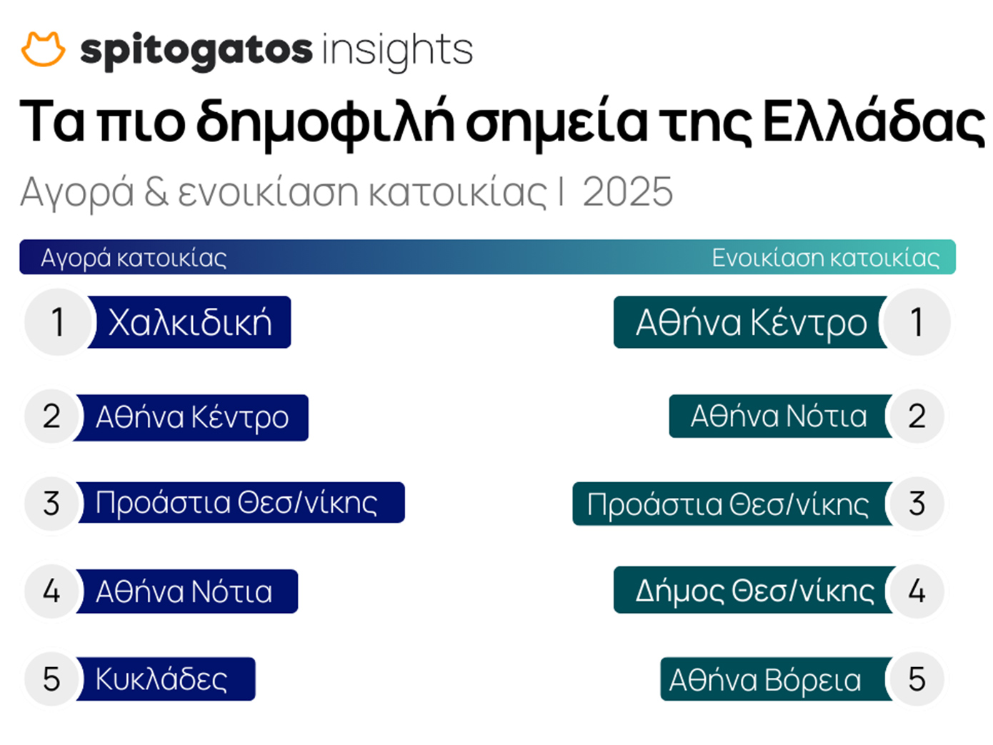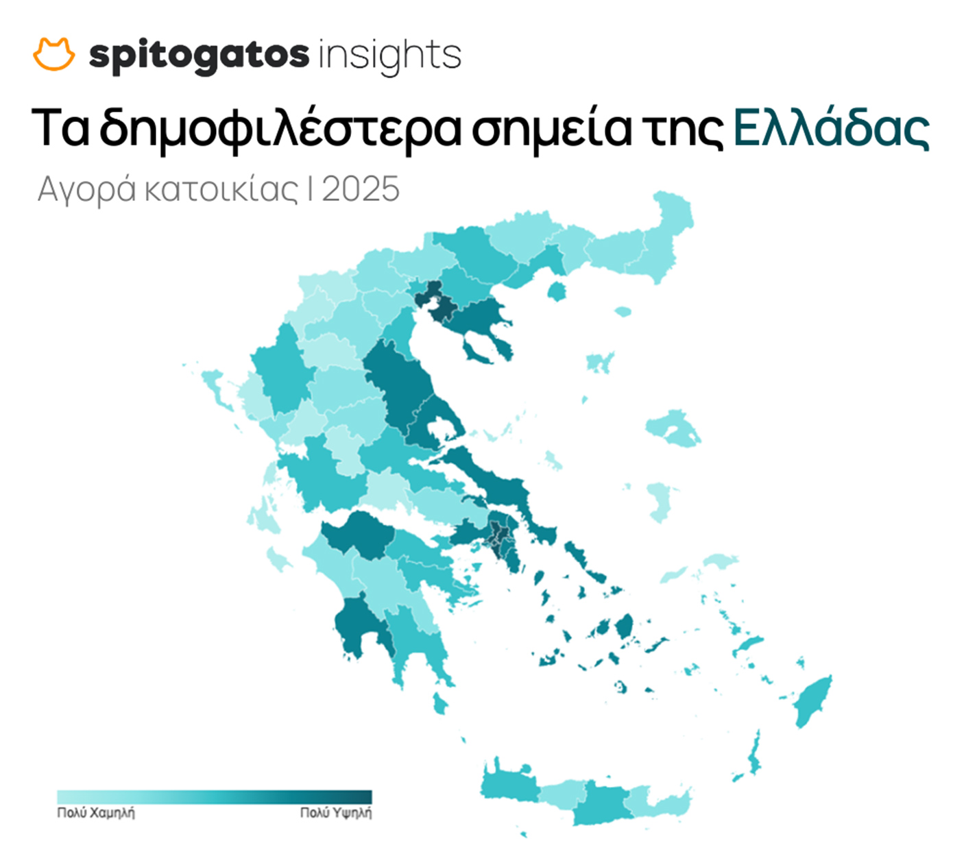 Το τέταρτο τρίμηνο του 2025 επιβεβαίωσε την κυριαρχία των μεγάλων αστικών κέντρων. Τα νότια, βόρεια και δυτικά προάστια της Αθήνας, καθώς και ο Δήμος και τα προάστια Θεσσαλονίκης, συγκέντρωσαν το υψηλότερο ενδιαφέρον για αγορά. Ακολούθησαν οι υπόλοιπες περιοχές της Αττικής, οι Κυκλάδες, η Εύβοια, η Μαγνησία, η Λάρισα, η Αχαΐα, η Μεσσηνία και η Χαλκιδική.