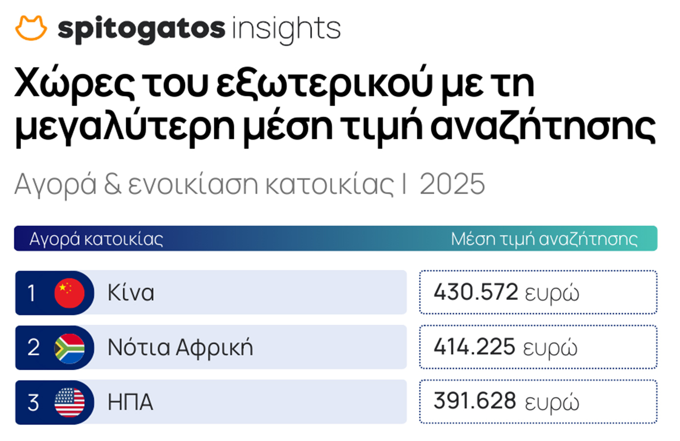 Ιδιαίτερο ενδιαφέρον παρουσιάζει και το προφίλ των ξένων αγοραστών. Οι ΗΠΑ, η Γερμανία, το Ηνωμένο Βασίλειο, η Κίνα και η Βουλγαρία βρίσκονται στην κορυφή της λίστας ζήτησης. Οι μέσες τιμές αναζήτησης δείχνουν ότι δεν πρόκειται για αγορές χαμηλού κόστους: η Κίνα προηγείται με περίπου 430.000 ευρώ, ακολουθεί η Νότια Αφρική με περίπου 414.000 ευρώ και οι ΗΠΑ με περίπου 391.000 ευρώ.