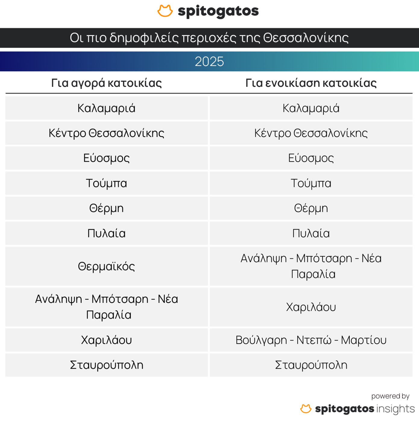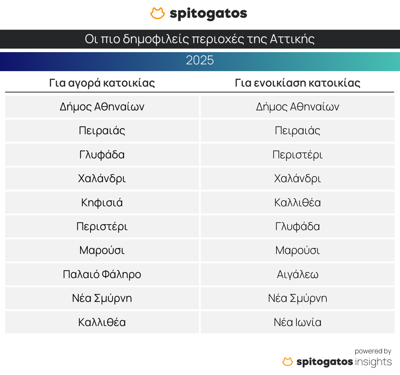 Στην αγορά ενοικίασης, ο Δήμος Αθηναίων διατηρεί τα πρωτεία, με τον Πειραιά και το Περιστέρι να καταγράφουν σημαντική ενίσχυση της ζήτησης. Χαλάνδρι, Καλλιθέα, Γλυφάδα, Μαρούσι, Αιγάλεω και Νέα Σμύρνη ακολουθούν, ενώ η Νέα Ιωνία εισέρχεται για πρώτη φορά στη δεκάδα, αναδεικνύοντας τη στροφή προς πιο προσιτές περιοχές. Στη Θεσσαλονίκη, ξεχωρίζουν η Καλαμαριά, το Κέντρο, ο Εύοσμος, η Τούμπα, η Θέρμη και η Πυλαία, με τον Θερμαϊκό και τις ανατολικές συνοικίες να παραμένουν ψηλά στις προτιμήσεις.