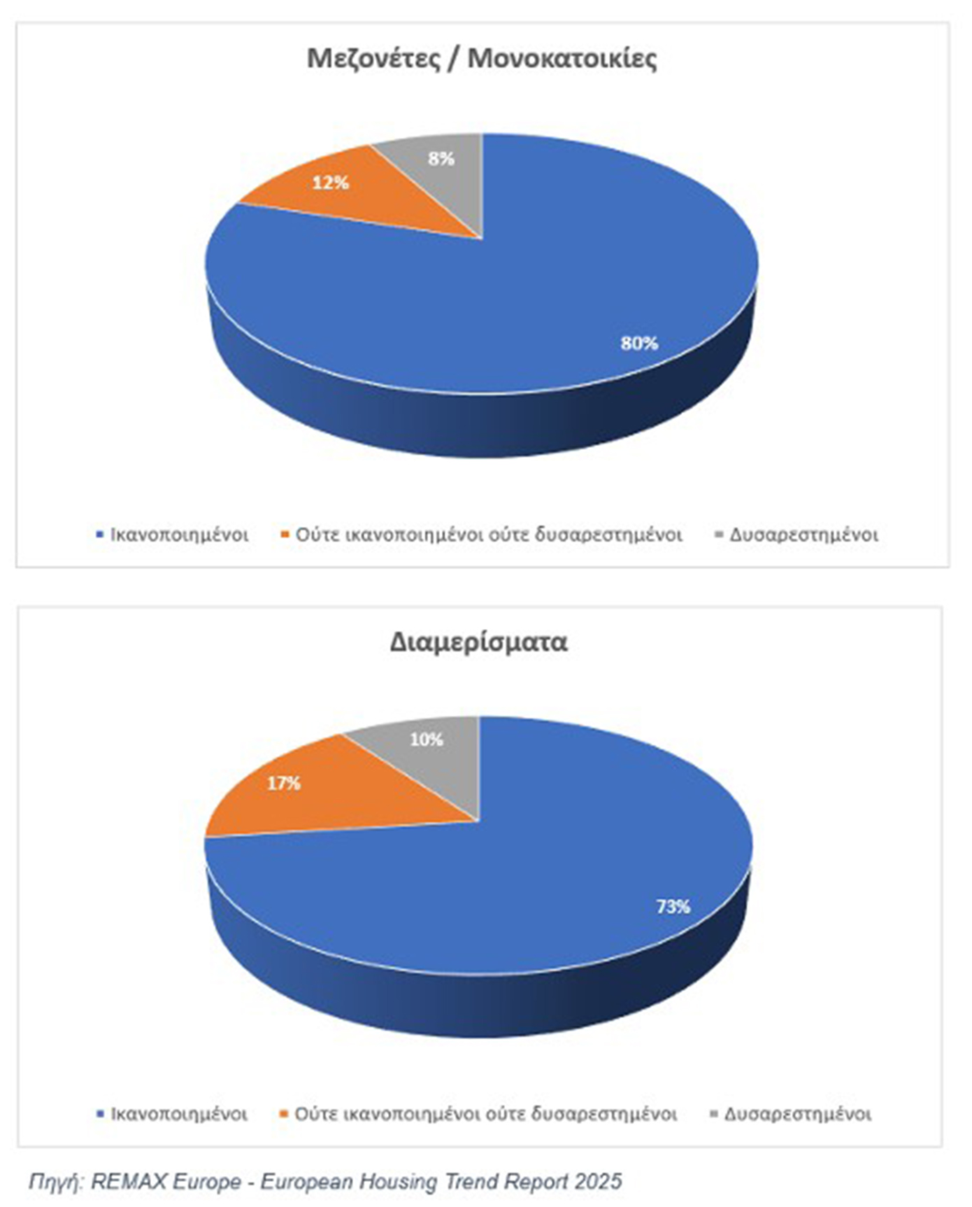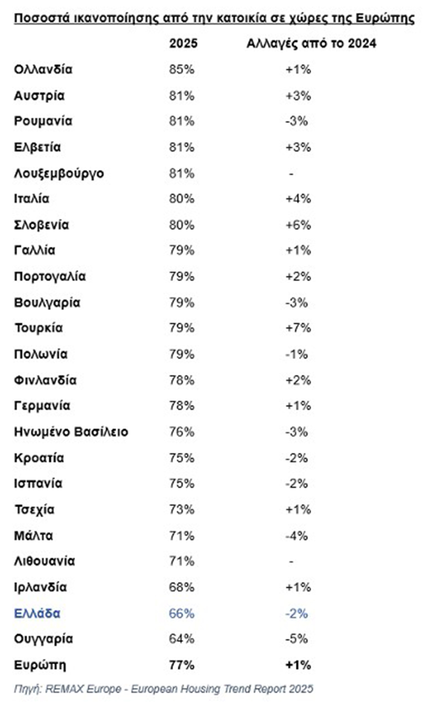 Σύμφωνα με την πανευρωπαϊκή έρευνα European Housing Trend Report 2025 του δικτύου REMAX Europe, το 66% των Ελλήνων δηλώνει ικανοποιημένο από τις συνθήκες στέγασης. Το ποσοστό αυτό είναι μειωμένο σε σχέση με το 2024, την ώρα που ο ευρωπαϊκός μέσος όρος διαμορφώνεται στο 77%, παρουσιάζοντας μικρή άνοδο.