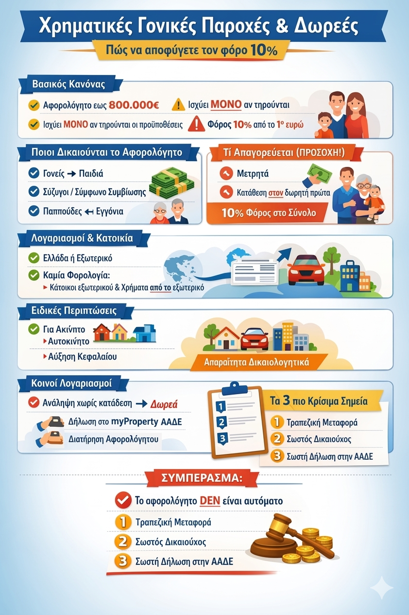Πολλοί φορολογούμενοι θεωρούν λανθασμένα πως όλες οι χρηματικές δωρεές μεταξύ συγγενών της Α’ κατηγορίας και οι γονικές παροχές καλύπτονται οριζόντια από το αφορολόγητο των 800.000 ευρώ. Η πραγματικότητα όμως είναι διαφορετική: Αν δεν τηρηθούν οι αυστηρές προϋποθέσεις του νόμου, ελλοχεύει ο κίνδυνος αυτοτελούς φορολόγησης με συντελεστή 10% από το πρώτο ευρώ.
