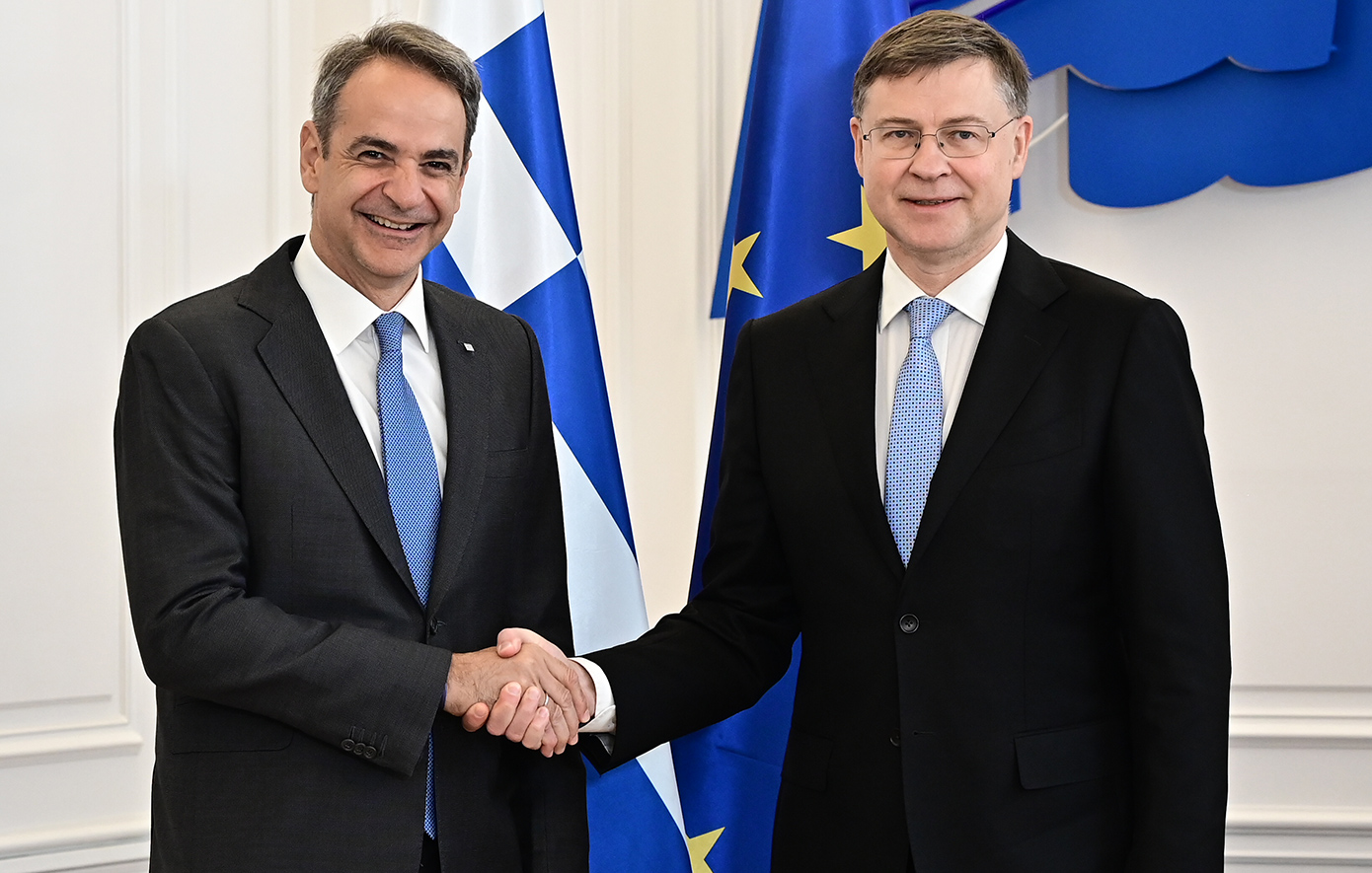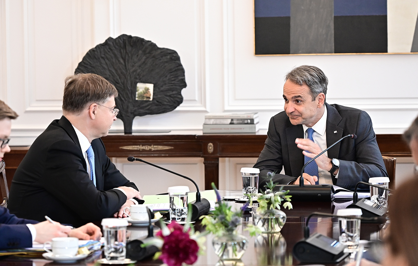 Η δυναμική πορεία της ελληνικής οικονομίας βρέθηκε στο επίκεντρο της συνάντησης του πρωθυπουργού Κυριάκου Μητσοτάκη με τον Ευρωπαίο επίτροπο Οικονομίας και Παραγωγικότητας, Εφαρμογής και Απλούστευσης, Βάλντις Ντομπρόβσκις, στο Μέγαρο Μαξίμου.
