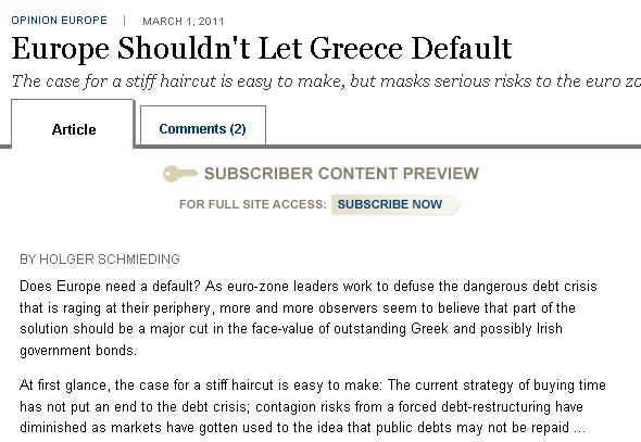 Με τον τίλο αυτό φιλοξενεί η Wall Street Journal άρθρο του Holger Schmiding, επικεφαλής οικονομολόγου στην Berenberg Bank, που αναφέρεται στη στήριξη της Ελλάδας ούτως ώστε να αποφευχθεί το ενδεχόμενο χρεωκοπίας.