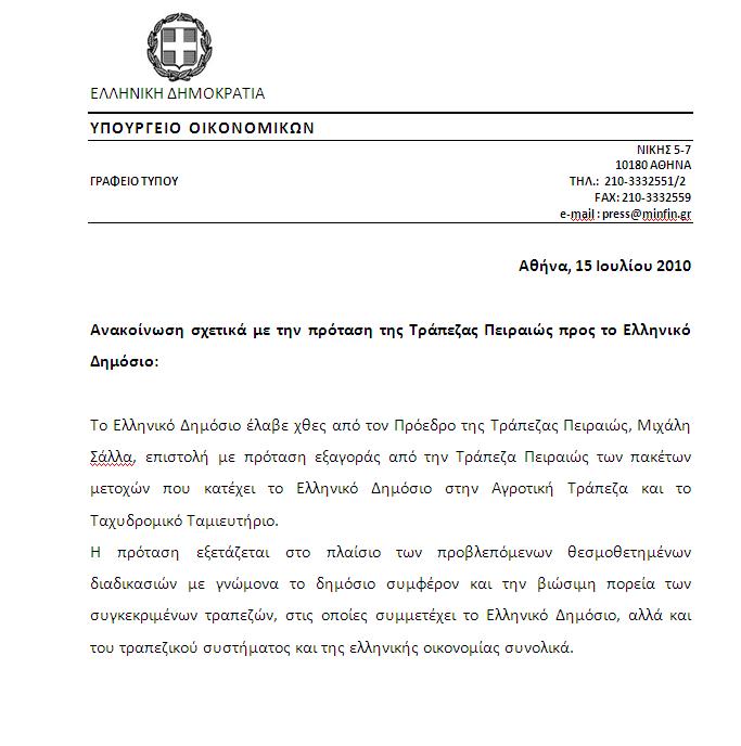 Ανταποκρινόμενος ουσιαστικά στο κάλεσμα κυβέρνησης για συγχωνεύσεις τραπεζών ο επικεφαλής του ομίλου της τράπεζας Πειραιώς, Μιχάλης Σάλλας, κατέθεσε χθες το απόγευμα στον υπουργό Οικονομικών, Γιώργο Παπακωνσταντίνου επίσημη πρόταση εξαγοράς μεριδίων της Αγροτικής Τράπεζας και του Ταχυδρομικού Ταμιευτηρίου, την οποία παρουσίασε σήμερα στους δημοσιογράφους.