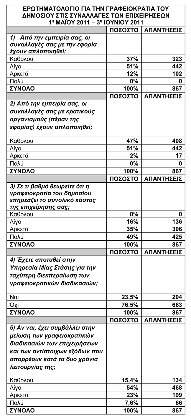 Τα αποτελέσματα που προκύπτουν από την συμμετοχή 867 επιχειρήσεων, κατά την περίοδο 1η Μαΐου 2011 έως 3η Ιουνίου 2011, διαμορφώθηκαν ως εξής: