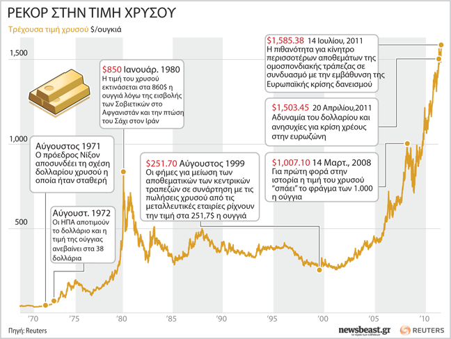 Από το 1971 έως και σήμερα η τιμή του χρυσού ανά ουγγιά διανύει μία ξέφρενη πορεία ανόδου. Το 1971 η τιμή του χρυσού ανά ουγγιά διαμορφωνόταν στα 35 δολάρια, ενώ σήμερα σημειώνει ιστορικό υψηλό με 1.585,38 δολάρια ανά ουγγιά.