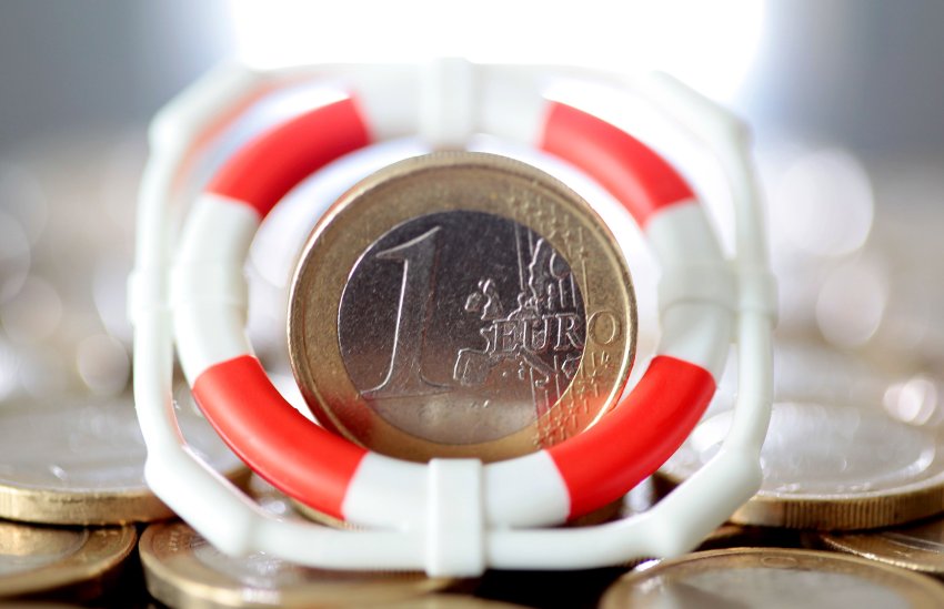 Το ελληνικό νόμισμα του ευρώ με σύμβολο την κουκουβάγια τοποθετημένο πάνω σε ένα κουτί πρώτων βοηθειών όπου αναγράφεται στα γερμανικά η λέξη «βοήθεια».