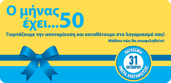 Έτσι, κάθε κατάστημα του Ταχυδρομικού Ταμιευτηρίου σε όλη την Ελλάδα, γιορτάζει και περιμένει να σας υποδεχτεί, από σήμερα μέχρι και το τέλος του μήνα, με το σύνθημα «Ο μήνας έχει…50».