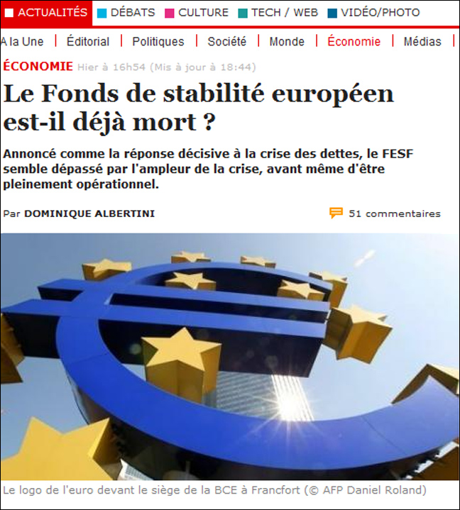 Με τίτλο «Το Ευρωπαϊκό Ταμείο Σταθερότητας είναι ήδη νεκρό;» η εφημερίδα Libération χαρακτηρίζει σε δημοσίευμά της το Ταμείο «Φτερό που χρησιμοποιείται για να αντιμετωπίσει ένα βουνό χρεών».