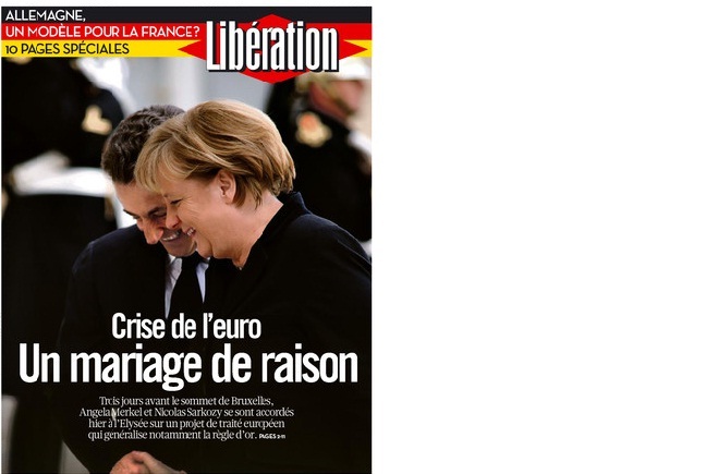 Με τη φράση «Ευρωπαϊκή κρίση χρέους: Ένας γάμος συμφέροντος» κυκλοφορεί σήμερα το φύλλο της γαλλικής Liberation, έχοντας στο προσκήνιο τη χθεσινή σύσκεψη Σαρκοζί – Μέρκελ και τις αποφάσεις για την κοινή δημοσιονομική πολιτική υπό το βάρος «αυστηρών αυτόματων κυρώσεων» για τις χώρες που… παρατυπούν.