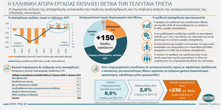 Κατά 150.000 θέσεις -5,2% σωρρευτικά- αυξήθηκε η απασχόληση στον ιδιωτικό τομέα από τα μέσα του 2014 έως το πρώτο τρίμηνο του 2017, σύμφωνα με μελέτη της Διεύθυνσης Οικονομικής Ανάλυσης της Εθνικής Τράπεζας της Ελλάδας. Ο μέσος ετήσιος ρυθμός αύξησης της απασχόλησης ανέρχεται στο 1,5%, σε μια περίοδο που το ΑΕΠ παρέμεινε σχεδόν στάσιμο. Το ποσοστό ανεργίας έχει υποχωρήσει κατά 6 ποσοστιαίες μονάδες, στο 21,7% τον Απρίλιο του 2017 (χαμηλό πενταετίας), παραμένοντας, ωστόσο, υπερδιπλάσιο του μέσου όρου της ευρωζώνης.