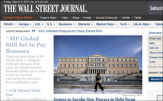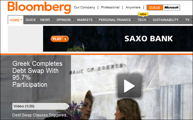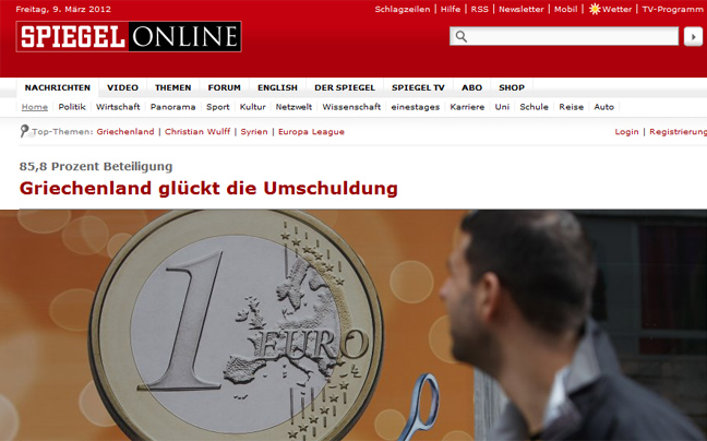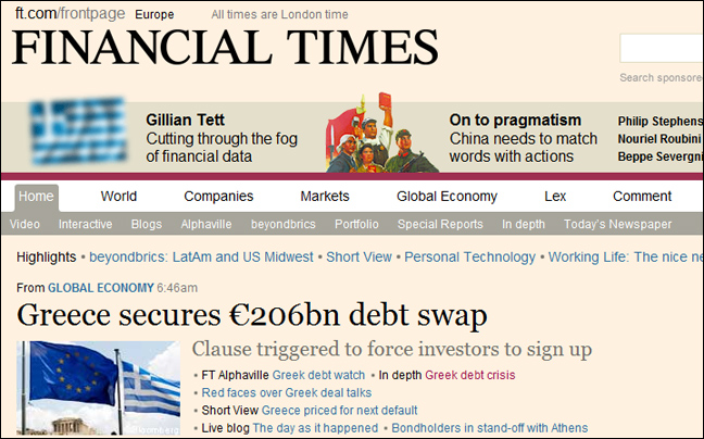 Στα βασικά θέματα των περισσότερων μέσων ενημέρωσης σε όλο τον κόσμο συμπεριλαμβάνεται η ολοκλήρωση του PSI στο 95,7%. «Η Ελλάδα», γράφουν οι οι Financial Times, «διασφαλίζει ανταλλαγή 206 δισ. ευρώ».
