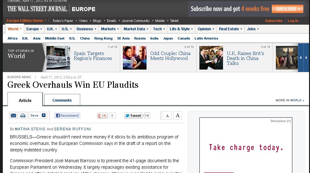 Σύμφωνα με το έγγραφο που έχει στη διάθεσή της η WSJ, ο κ. Μπαρόζο αναμένεται να πει στο Ευρωπαϊκό Κοινοβούλιο την Τετάρτη ότι «ο λαός της Ελλάδας δεν είναι μόνος του στην προσπάθεια για την επιστροφή της χώρας στην ανάπτυξη και την απασχόληση».