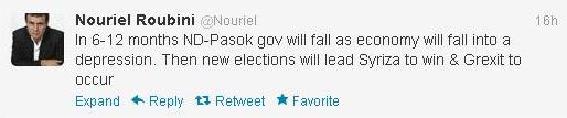 Την πεποίθησή του ότι μια κυβέρνηση Νέας Δημοκρατίας-ΠΑΣΟΚ θα αποτύχει παταγωδώς μέσα στους επόμενους έξι με δώδεκα μήνες καθώς η οικονομία θα βυθιστεί περαιτέρω στην ύφεση αναφέρει στο λογαριασμό του στο Twitter ο γνωστός οικονομολόγος Νουριέλ Ρουμπινί.
