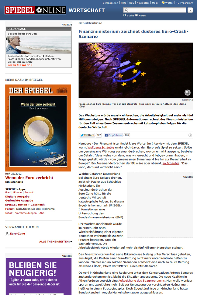Άρθρο με τίτλο «Το γερμανικό υπουργείο Οικονομικών παρουσιάζει ζοφερό σενάριο κατάρρευσης του ευρώ» φιλοξενεί το γερμανικό περιοδικό Spiegel, το οποίο αναφέρεται στο σενάριο κατάρρευσης της Ευρωζώνης επικαλούμενο έγγραφο του γερμανικού υπουργείου.