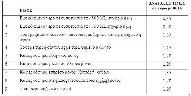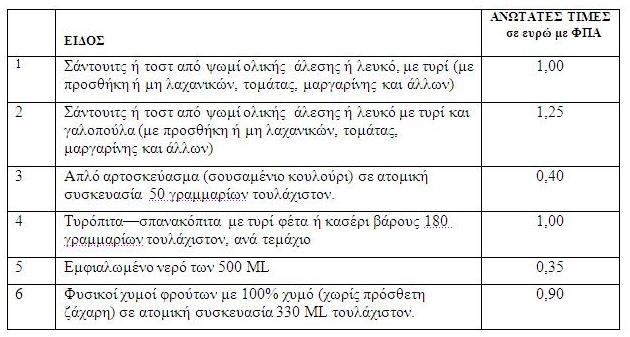 Ειδικότερα για τα σχολικά κυλικεία οι τιμές διαμορφώνονται ως εξής: