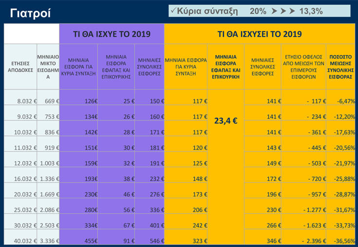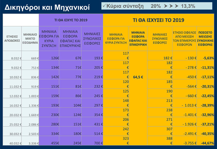 Η ασφαλιστική εισφορά για κύρια σύνταξη των ελεύθερων επαγγελματιών και των αυτοαπασχολουμένων, μειώνεται, από την 1η Ιανουαρίου 2019, κατά 33,3%, από 20% που είναι σήμερα, στο 13,33%.