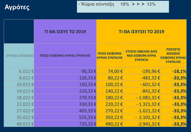 Η ασφαλιστική εισφορά για κύρια σύνταξη των αγροτών μειώνεται, επίσης, κατά 33,3%, στο 12% από 18% που θα ήταν την 1η Ιανουαρίου 2019. Η διαμόρφωση της ασφαλιστικής εισφοράς ορίζεται σε ποσοστό 12,67% το 2020, σε ποσοστό 13% το 2021 και σε ποσοστό 13,33% από το 2022 και μετά.