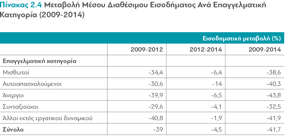 Όμως με την εκδήλωση της κρίσης, δηλαδή την περίοδο 2009-2014, το ισοδύναμο εισόδημα μειώθηκε πολύ περισσότερο από όσο αυξήθηκε προηγουμένως, κατά 42%.