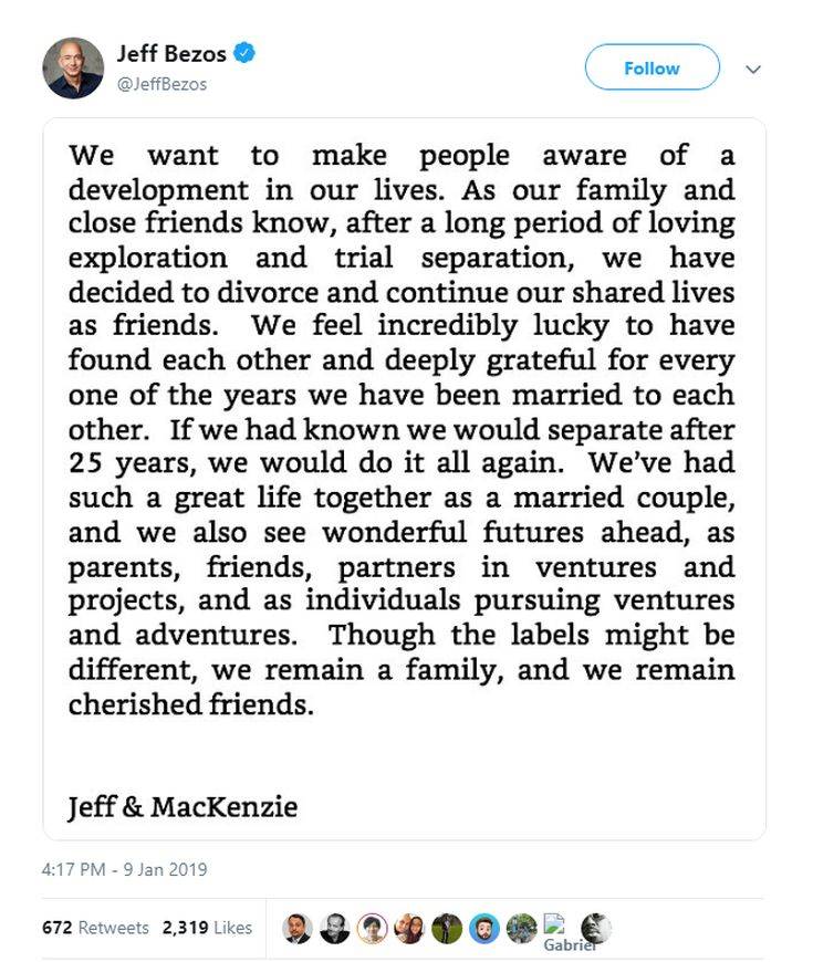 «Ο κόσμος ανησυχεί πως λόγω του διαζυγίου, η γυναίκα του θα πάρει τις μισές μετοχές του και πως αυτό θα θέσει σε κίνδυνο το μέλλον της εταιρείας» ανέφερε μία από τις πηγές. «Αλλά όλο αυτό έχει επιλυθεί από πέρσι. Η Amazon δεν κινδυνεύει. Ο διακανονισμός του διαζυγίου έχει προχωρήσει πολύ περισσότερο από όσο ξέρει ο οποιοσδήποτε. Τόσο ο Τζεφ όσο και η σύζυγός του είναι έξυπνοι άνθρωποι. Εκείνος κρατά τον έλεγχο της Amazon».