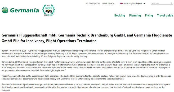 Όσοι είχαν αγοράσει εισιτήριο από ταξιδιωτικό γραφείο στο πλαίσιο κάποιου πακέτου που συμπεριλαμβάνει πτήση και διαμονή «μπορούν να έρθουν σε επαφή με τον ταξιδιωτικό τους πράκτορα για να τους κλείσει άλλη πτήση», διαβεβαίωσε η Germania, αλλά για τους επιβάτες που «έκλεισαν εισιτήριο απευθείας» από την εταιρεία «δυστυχώς δεν υπάρχει» καμία δυνατότητα να εξυπηρετηθούν, διευκρίνισε.