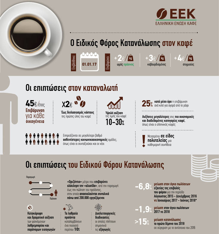 Σύμφωνα με τα αποτελέσματα της μελέτης της Nielsen «Elasticity Study», διαπιστώνεται ότι η συνολική ζήτηση στον καφέ κινείται με αρνητική ποσοστιαία μεταβολή της τάξεως του -6,8% (στοιχεία για την περίοδο Αύγουστος 2015 – Δεκέμβριος 2016 vs Ιανουάριος 2017 – Ιούνιος 2018) ως απόρροια της επιβολής του Ειδικού Φόρου Κατανάλωσης στον καφέ ενώ στο σύνολο του 2018, η μείωση του όγκου πωλήσεων σε σχέση με το 2017 άγγιξε το -1,9%.