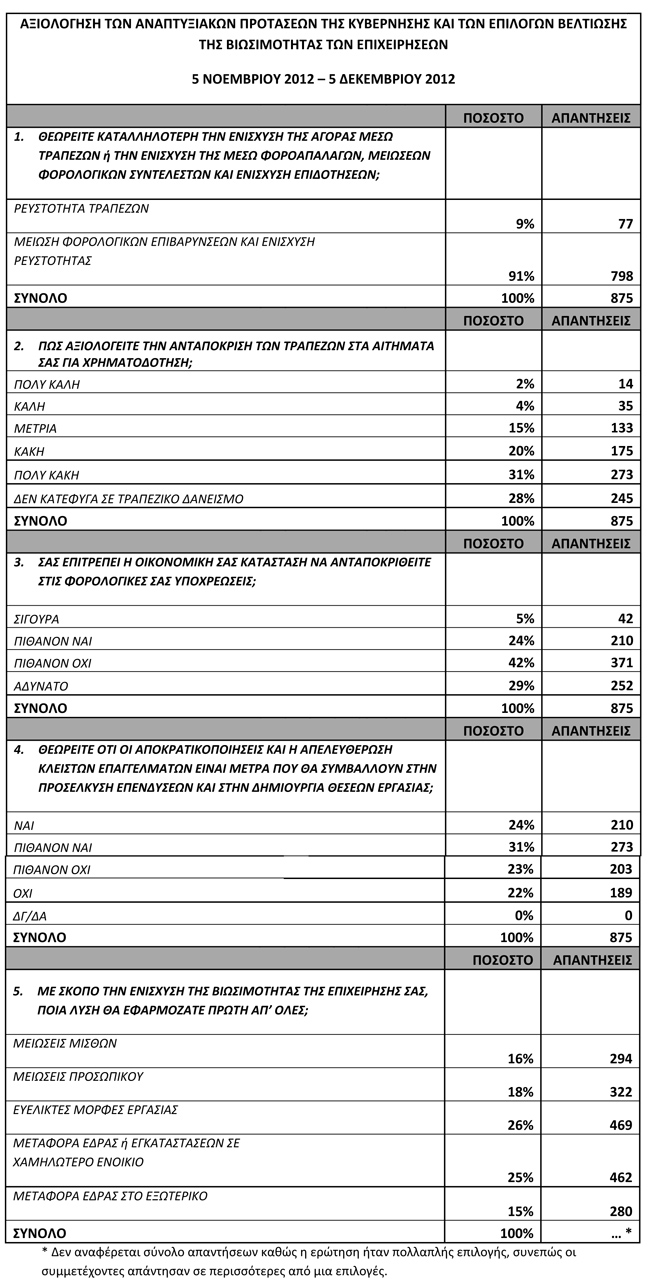Δίνοντας στη δημοσιότητα την έρευνα, ο πρόεδρος της ΚΕΕΕ και του ΕΒΕΑ, κ. Κωνσταντίνος Μίχαλος, δήλωσε: «όπως καταδεικνύεται από την έρευνα, το μείζον πρόβλημα για την αγορά τη δεδομένη περίοδο είναι η υπερφορολόγηση των επιχειρήσεων, αλλά και η αδυναμία των τραπεζών να τους χορηγήσουν τα αναγκαία κεφάλαια κίνησης.
