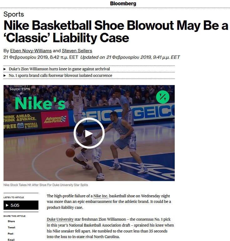 Κι έτσι, ένα αριστερό παπούτσι Nike που άνοιξε στα δύο στη διάρκεια αγώνα μπάσκετ δεν είναι μόνο μια ντροπιαστική στιγμή για την εταιρεία αλλά ένα περιστατικό που πιθανώς να έχει νομική συνέχεια και να την αναγκάσει να καταβάλει υψηλή αποζημίωση στον παίκτη που τραυματίστηκε.
