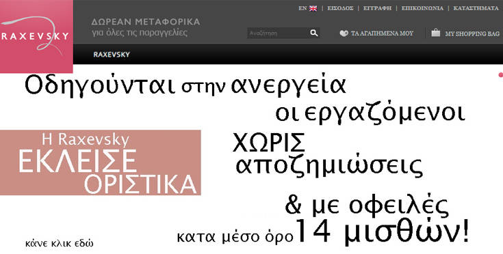 Ρολά κατεβάζει ιστορικό ελληνικό brand γυναικείας ένδυσης, η Raxevsky. Μάλιστα, ένα μήνυμα που έχει αναρτηθεί από τους εργαζόμενους στην ιστοσελίδα της εταιρείας κάνει λόγο για οριστικό κλείσιμο, ενώ αναφέρεται πως «οι εργαζόμενοι οδηγούνται στην ανεργία χωρίς αποζημιώσεις και με οφειλές κατά μέσο όρο 14 μισθών».