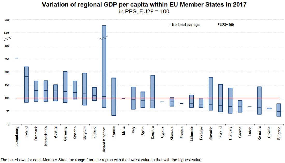 Οι περιφέρειες με το υψηλότερο κατά κεφαλήν ΑΕΠ στην ΕΕ είναι το κέντρο του Λονδίνου (626% του κοινοτικού), το Λουξεμβούργο (253%), η περιφέρεια της νότιας Ιρλανδίας (220%), το Αμβούργο (202%) και οι Βρυξέλλες (196%).