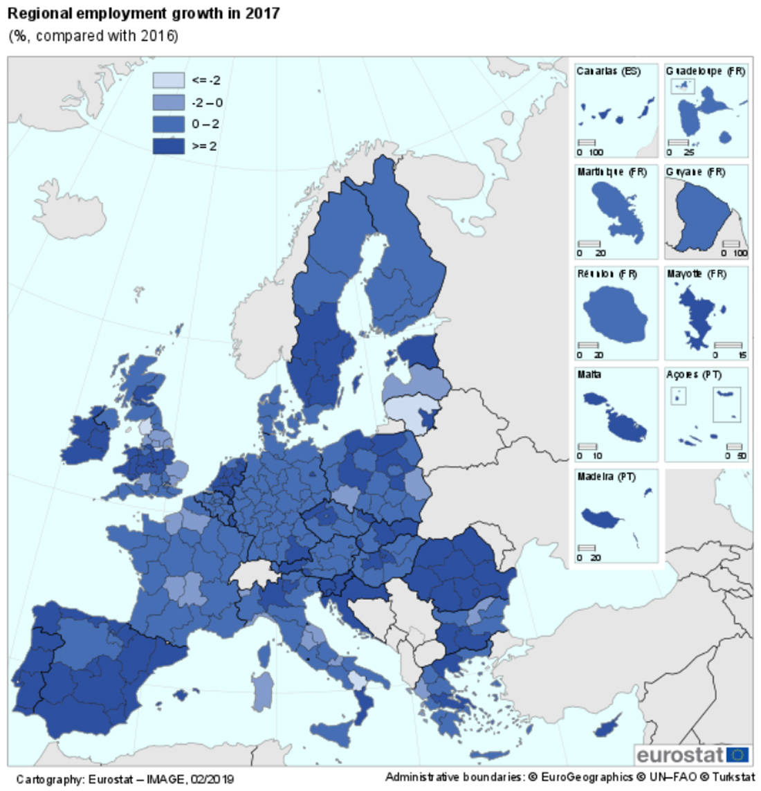Συνολικά στην ΕΕ, 253 περιφέρειες (90%) κατέγραψαν αύξηση της απασχόλησης το 2017, ενώ συνολικά το ποσοστό της απασχόλησης αυξήθηκε κατά 1,6%. Σε 26 περιφέρειες ο αριθμός των ατόμων που απασχολούνται μειώθηκε και σε δύο παρέμεινε σταθερός.