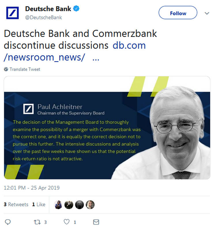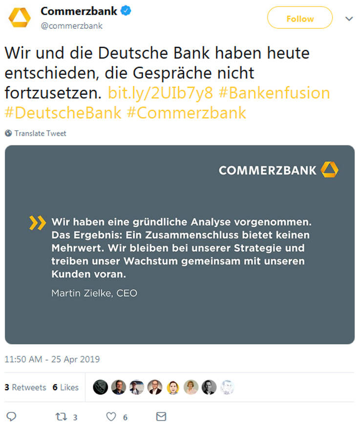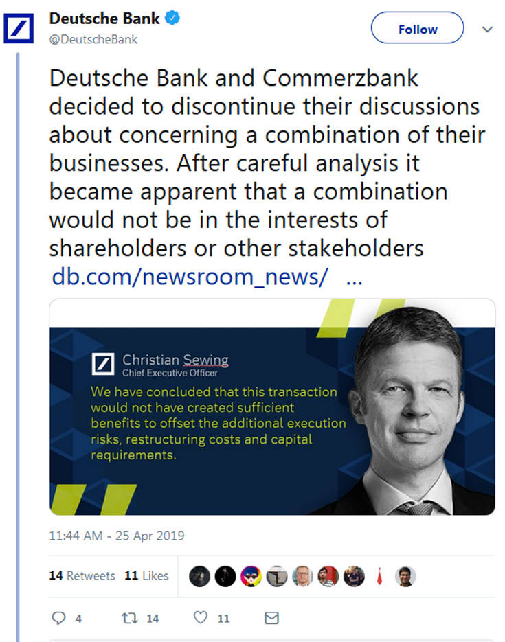 Τον Φεβρουάριο του 2019 ο Γερμανός υπουργός Οικονομικών Όλαφ Σολτς είχε δηλώσει ότι βρίσκεται σε συνομιλίες με τράπεζες αναφορικά με το μέλλον τους και είχε χαρακτηρίσει «εικασίες» τα δημοσιεύματα για συγχώνευση της Deutsche Bank και της Commerzbank. Σύμφωνα με δημοσιεύματα του Τύπου, η Γερμανία θα ήθελε η συγχώνευση των δύο μεγαλύτερων τραπεζών της να προχωρήσει πριν από τις ευρωεκλογές του Μαΐου. Ο Σολτς, ωστόσο, δήλωσε τότε ότι δεν μπορεί να φανταστεί ποια σχέση έχουν οι εκλογές με τον τραπεζικό κλάδο και ότι πρόκειται για εικασίες τις οποίες δεν μπορεί να καταλάβει.