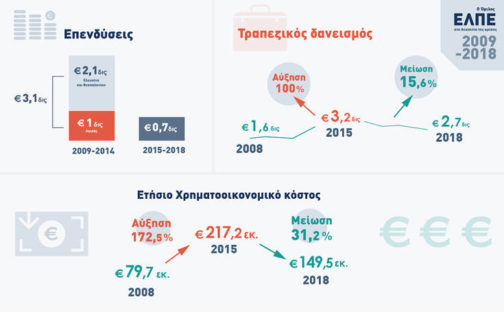 Αντίθετα, η υψηλή κερδοφορία της περιόδου 2015-2018 είχε ως συνέπεια τη μείωση των συνολικών υποχρεώσεων κατά €1,6 δισ. (-25,8%), του τραπεζικού δανεισμού κατά €500 εκατ. (-15,6%), καθώς και του ετήσιου χρηματοοικονομικού κόστους κατά €68 εκατ. (-31,2%).