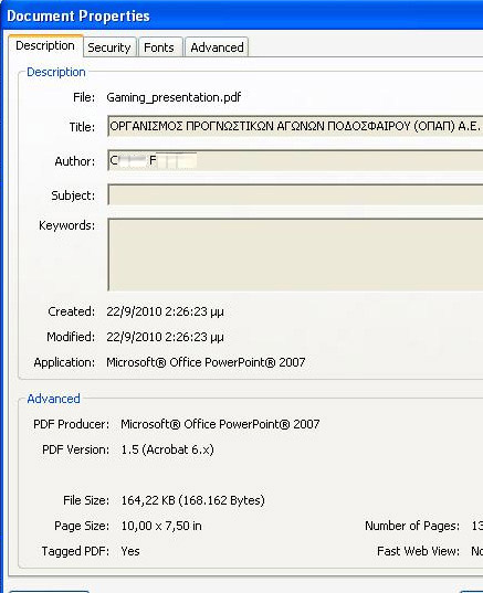 Κι αυτό γιατί η παρουσίαση που έγινε από τον γενικό γραμματέα αποκρατικοποιήσεων κ. Γιώργο Χριστοδουλάκη αποδεικνύεται, αν κάποιος «ψάξει» τις ιδιότητες που συνοδεύουν ένα τέτοιο έγγραφο, ότι έχει συνταχθεί από τον ίδιο τον ΟΠΑΠ, ο οποίος υποτίθεται ότι θα διεκδικήσει επί ίσοις όροις με τους ιδιώτες ενδιαφερόμενους τις νέες άδειες στον τζόγο!