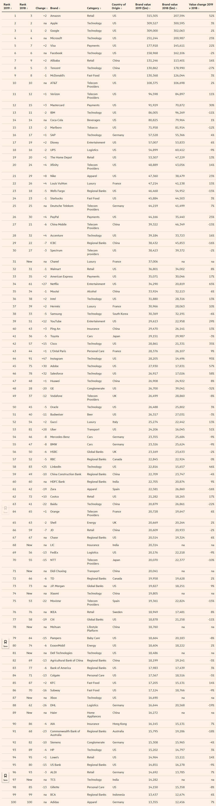 Όπως αναφέρουν οι Financial Times, που παρουσίασαν τον σχετικό πίνακα, η κατάταξη αντικατοπτρίζει την παγκόσμια φύση της καταναλωτικής οικονομίας, με απόλυτο κυρίαρχο τις ΗΠΑ, αλλά και την αυξανόμενη σημασία των κινεζικών εμπορικών σημάτων.