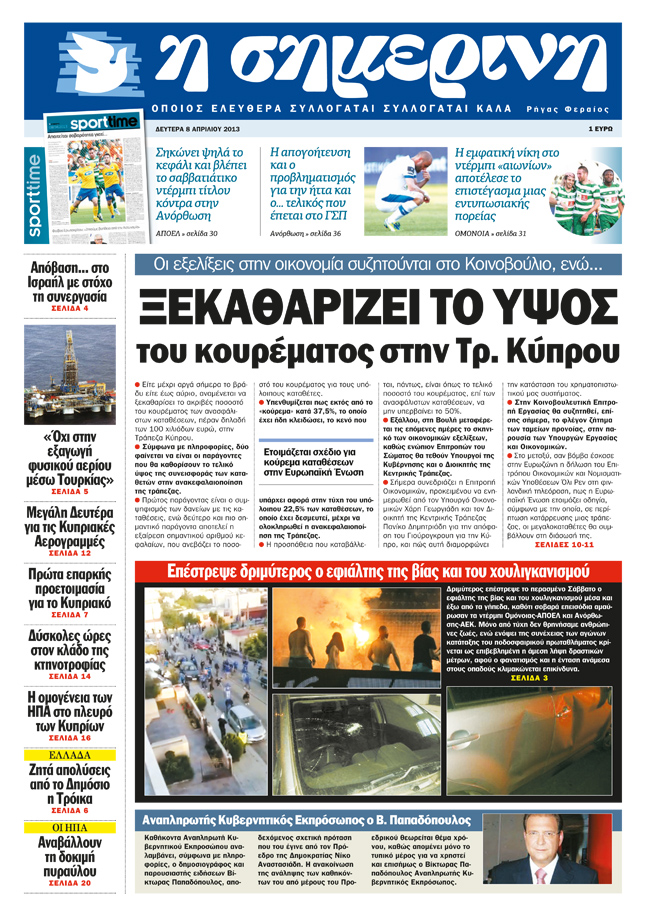 «Ο Φιλελεύθερος», με τίτλο «Δεν βγαίνει το κούρεμα», αναφέρει ότι καταβάλλεται προσπάθεια σε τεχνοκρατικό επίπεδο, το τελικό ποσοστό του επί των ανασφάλιστων καταθέσεων να μην υπερβαίνει το 50%. Οι παράγοντες που επηρεάζουν την όλη διαδικασία είναι ο συμψηφισμός των δανείων με τις καταθέσεις, οι εξαιρέσεις που υπάρχουν στο τραπέζι και η απορρόφηση μέρους των εργασιών και στοιχειών ενεργητικού της Λαϊκής Τράπεζας.