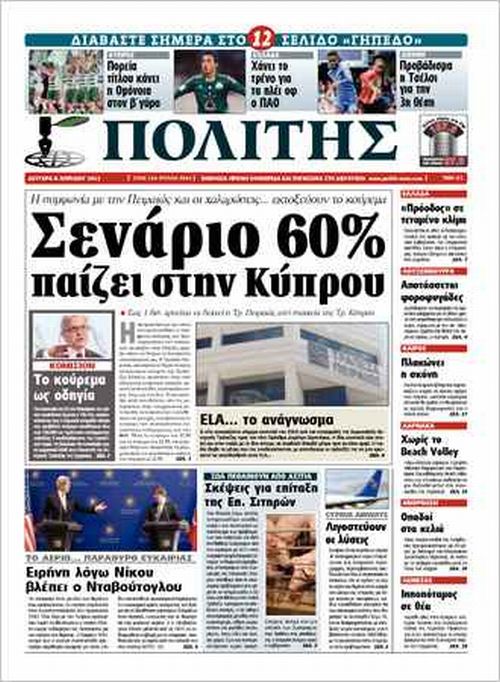 Ο «Πολίτης» αναφέρει ότι «Σενάριο 60% παίζει στην Κύπρου» και υποστηρίζει ότι αυτό οφείλεται στην «προχειρότητα, με την οποία συνομολογήθηκε η συμφωνία πώλησης των δραστηριοτήτων των κυπριακών τραπεζών στην Ελλάδα». Σύμφωνα με την εφημερίδα, η Τράπεζα Πειραιώς φορτώνει στην Τράπεζα Κύπρου αρκετά εκατομμύρια ευρώ, αφού αρνείται να δεχτεί τα εκτός ισολογισμού της Τράπεζας, λόγω των χαλαρώσεων στην υποχρεωτική μετατροπή ανασφάλιστων καταθέσεων, σε μετοχές, εκτοξεύοντας το «κούρεμα» των ανασφάλιστων καταθέσεων ενδεχομένως και στο 60%.