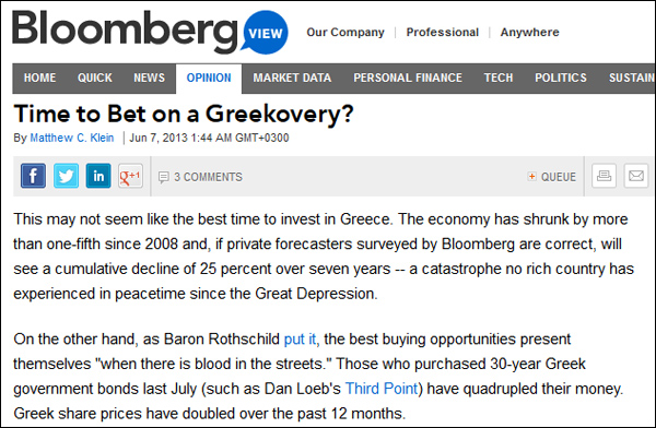 «Ίσως να μην είναι η καλύτερη στιγμή για επενδύσεις στην Ελλάδα. Η ελληνική οικονομία έχει συρρικνωθεί κατά περισσότερο από ένα πέμπτο από το 2008 και αν οι αναλυτές που συμμετείχαν σε δημοσκόπηση του Bloomberg επιβεβαιωθούν, η χώρα θα εμφανίσει συνολική πτώση 25% μέσα σε μια περίοδο επτά ετών – καταστροφή που καμία που καμία πλούσια χώρα δεν έχει ζήσει σε καιρό ειρήνης μετά την Μεγάλη Ύφεση».