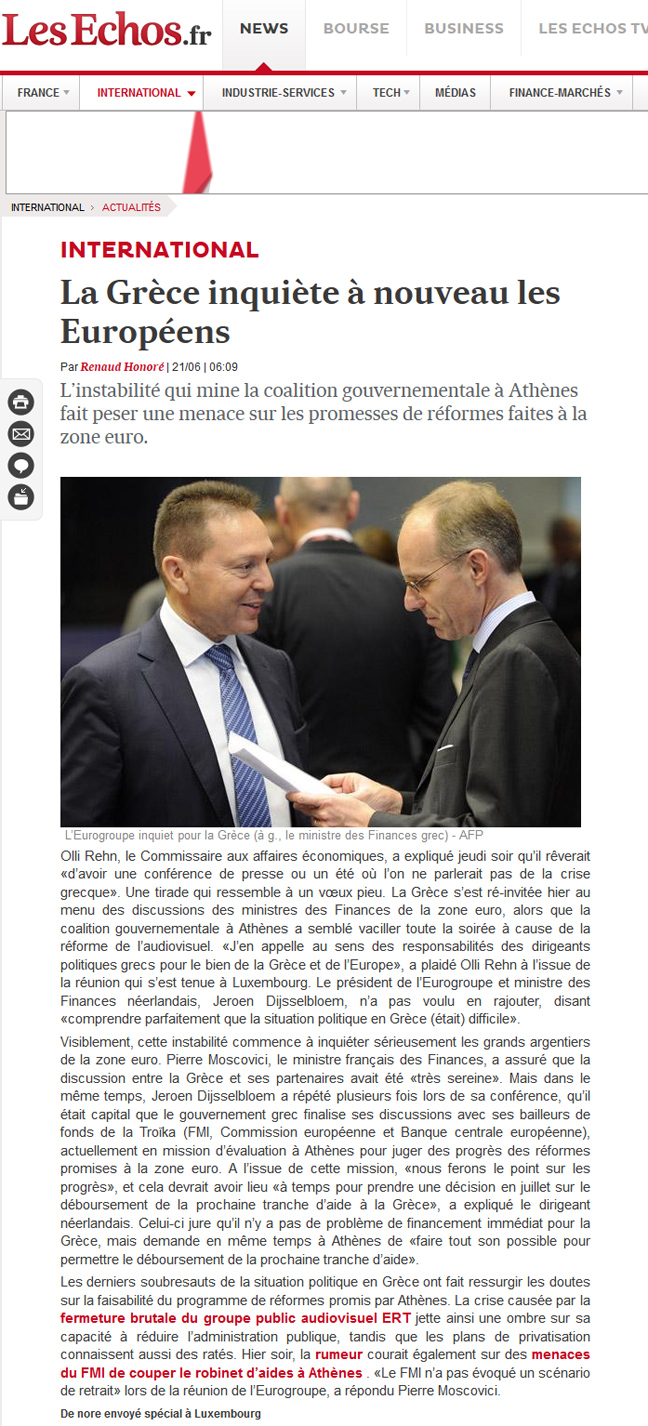 Οι τελευταίοι κλυδωνισμοί στην πολιτική κατάσταση στην Ελλάδα αναζωπύρωσαν τις αμφιβολίες για το πρόγραμμα μεταρρυθμίσεων που έχει υποσχεθεί η Αθήνα, επισημαίνει η εφημερίδα. Η κρίση που προκλήθηκε από το βίαιο λουκέτο στη δημόσια ραδιοτηλεόραση δημιούργησε βαριά σκιά στην ικανότητα της Ελλάδας να μειώσει το δημόσιο τομέα, την ώρα που και τα σχέδια ιδιωτικοποιήσεων δεν έχουν την αναμενόμενη πρόοδο, καταλήγει η «Les Echos».