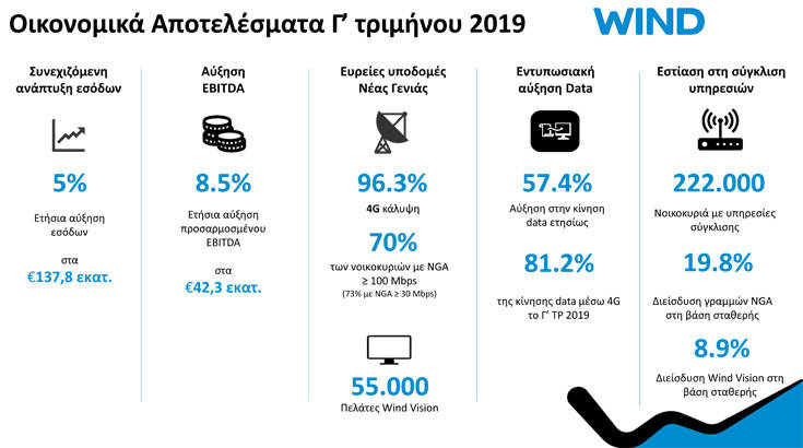 Οικονομικά αποτελέσματα Γ’ Τριμήνου 2019 ανακοινώνει σήμερα η WIND Ελλάς, με αύξηση εσόδων και ενίσχυση της πελατειακής βάσης τόσο σε ιδιώτες όσο και σε επιχειρήσεις.