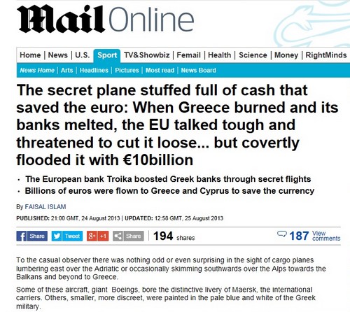 Για ένα μυστικό σχέδιο αερομεταφοράς 10 δισεκατομμυρίων στην Ελλάδα από την ΕΕ, που στήθηκε το καλοκαίρι του 2011 ώστε η χώρα να μην πτωχεύσει, κάνει λόγο σε δημοσίευμά της η βρετανική Daily Mail.