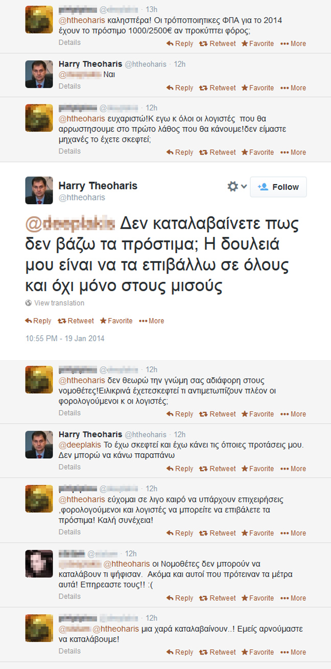 Εισηγήσεις προς την ηγεσία του υπουργείου Οικονομικών για τα νέα πρόστιμα του Κώδικα Φορολογικής Διαδικασίας έχει διατυπώσει ο γενικός γραμματέας Εσόδων Χάρης Θεοχάρης, όπως ο ίδιος ανέφερε σε πολίτες, σε διάλογό τους μέσω Twitter.