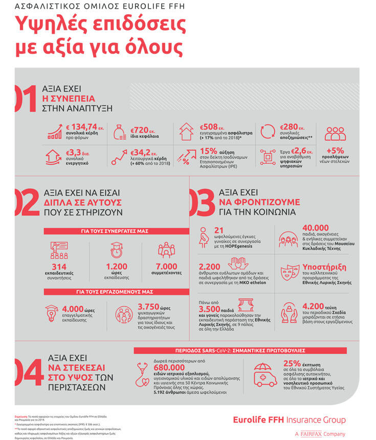 Ένα ιδιαίτερα παραγωγικό έτος, με θετική οικονομική αποτίμηση, ήταν το 2019 για τον Όμιλο Eurolife FFH, μέλος της Fairfax Financial Holdings Limited. Οι σημαντικές του επιδόσεις, σε συνδυασμό με μια σειρά από νέες πρωτοβουλίες και έργα, θέτουν τα θεμέλια για μια σθεναρή αντιμετώπιση των προκλήσεων της τρέχουσας χρονιάς. Για τον Όμιλο Eurolife FFH, αξία έχει να βρίσκεται στο πλευρό των ανθρώπων που εμπιστεύονται τα προϊόντα και τις υπηρεσίες του, πελάτες και συνεργάτες, με στόχο να τους ενδυναμώνει να καταφέρνουν περισσότερα καθημερινά.